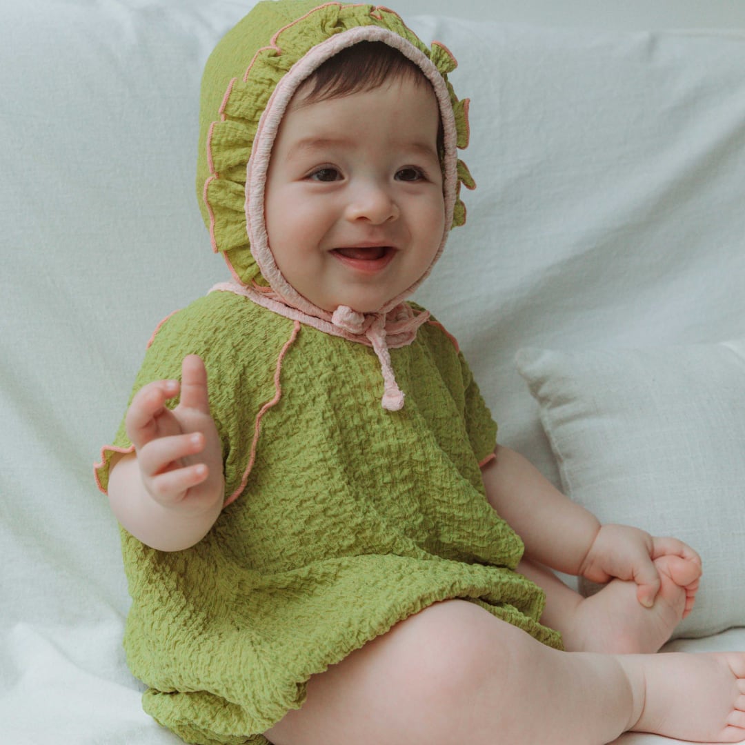抹茶色のポップコーンベビースーツ。